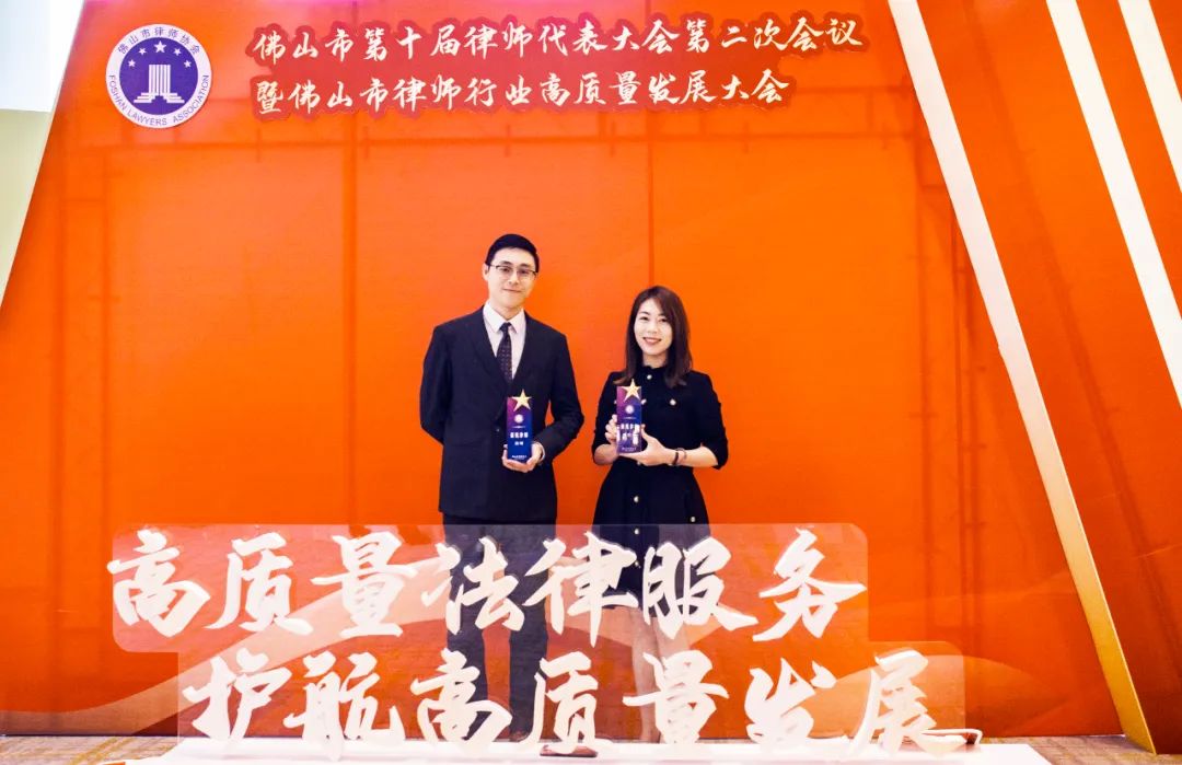 李侃童律师、吴珺律师分别获得“佛山市新锐律师(第一届)”表彰奖杯。